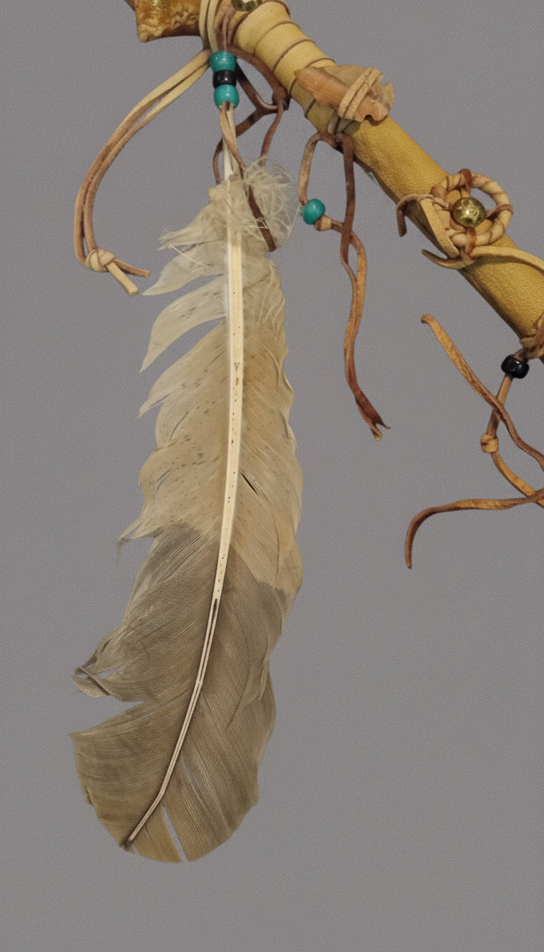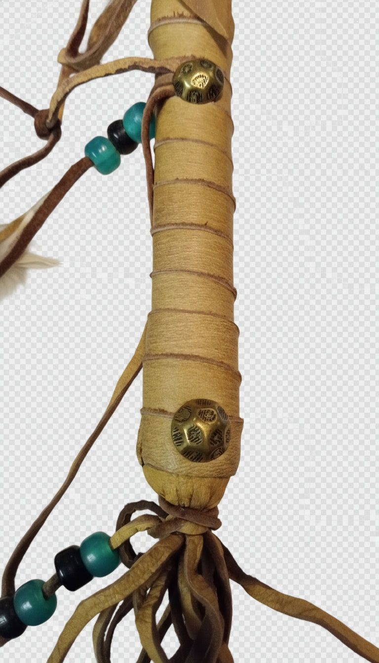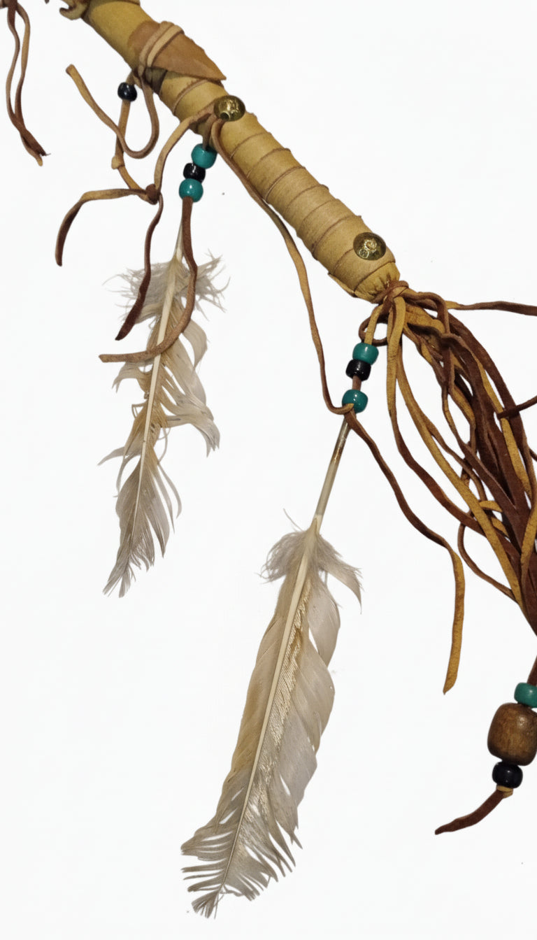 The Design: Notice the intricate details: the elegant wrapping, the careful placement of the feathers, and the thoughtful use of leather fringe and wooden beads.
