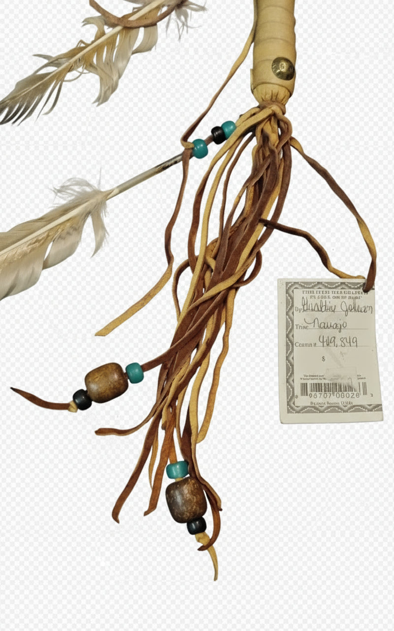 Imagine the quiet focus as Geraldine wrapped the supple leather, tied the vibrant blue beads, and carefully adorned this stick, weaving her personal connection to her heritage into every detail. This rattle is a stunning representation of the artistry passed down through generations of the Navajo Nation.