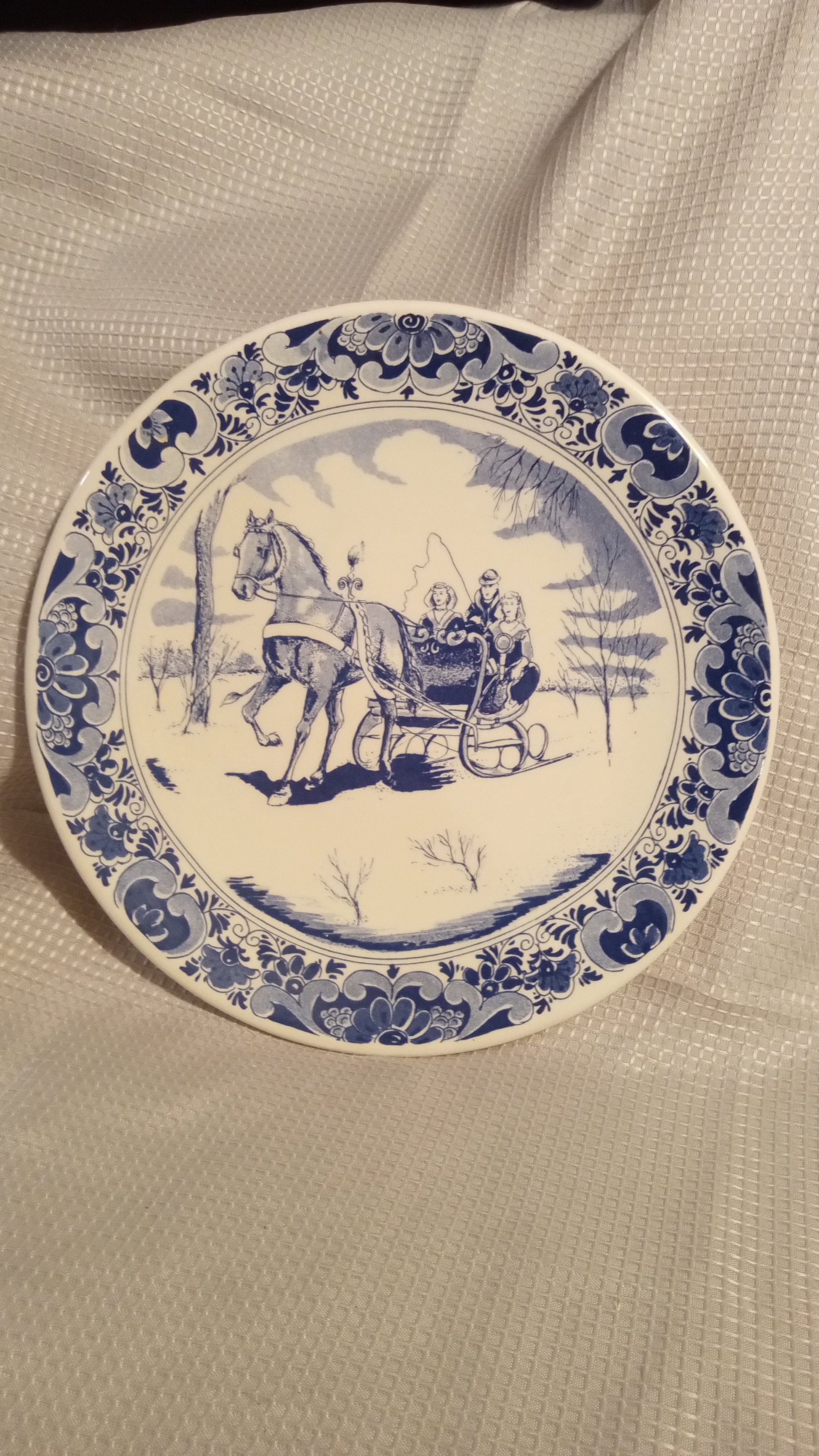 This magnificent, large decorative plate, marked "De Delftsche Schouwe Handgeschilderd" (Hand-painted), represents a remarkable find for Delftware collectors. It depicts a beautiful, lively Dutch Sleigh Scene—a fascinating snapshot of life in Holland, painted with the iconic cobalt blue that defines Delftware tradition.
