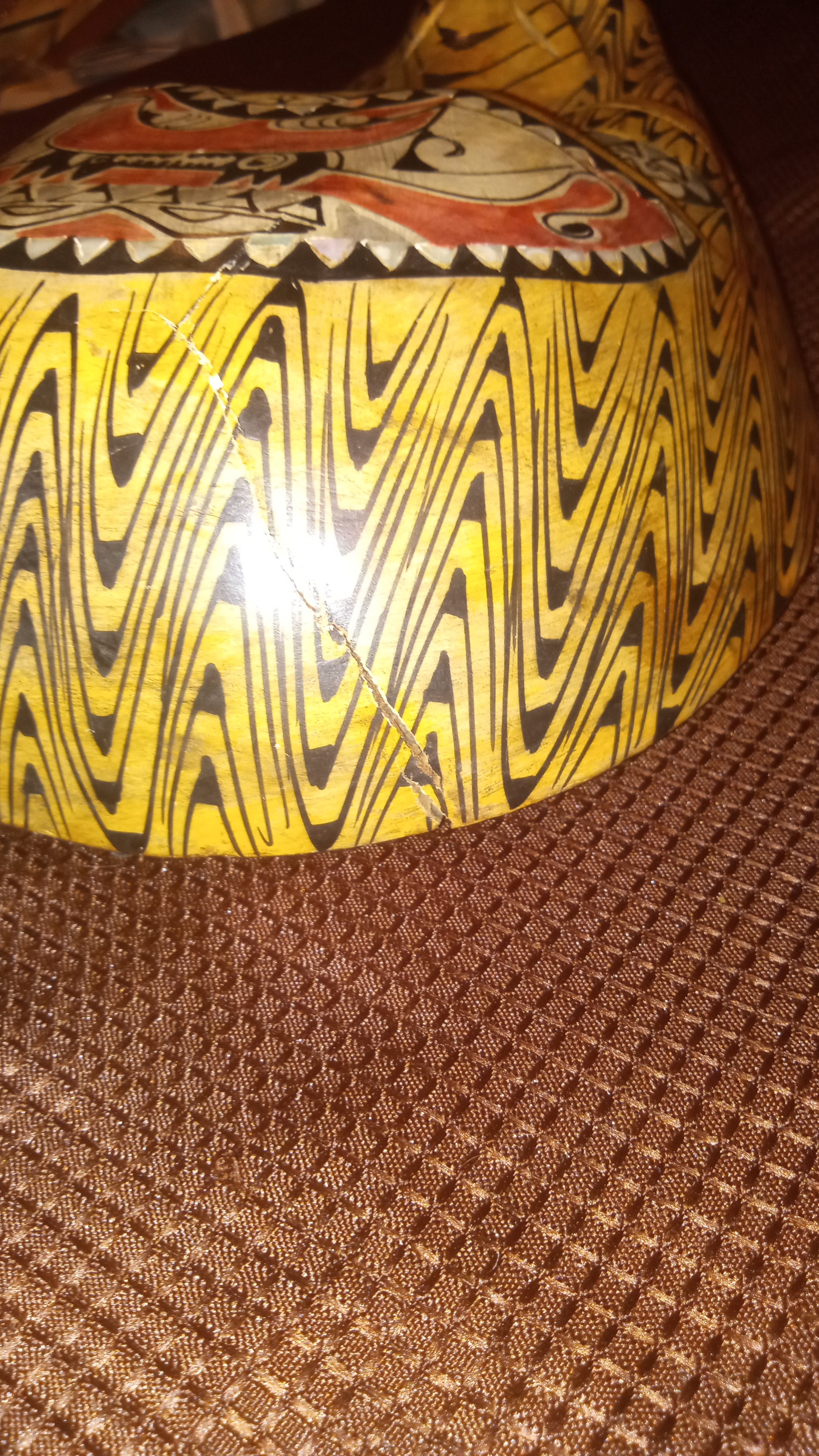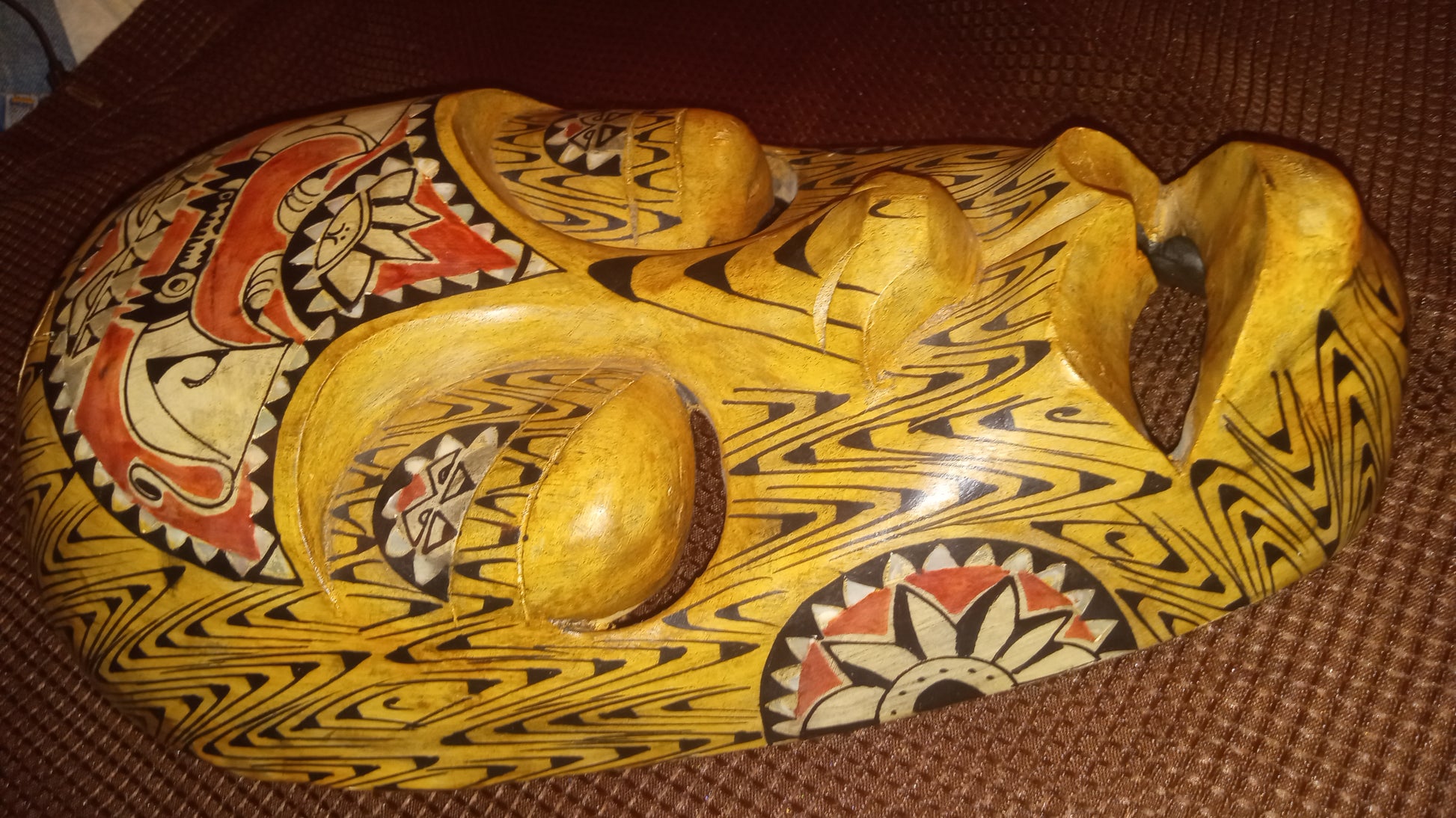 Feel the smooth, warm wood that forms the face, deeply carved with mesmerizing zigzag patterns that dance across its surface. Your eyes will be drawn to the striking contrasts: the bold black lines against the natural wood, accented by flashes of vibrant red and stark white.