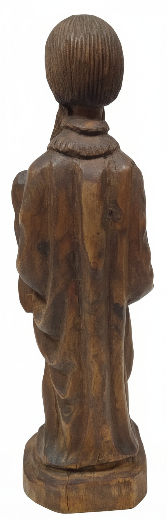 The rich, deep tones and subtle grain of the olive wood make this statue a warm, grounded, and striking addition to any library, study, or sacred space.