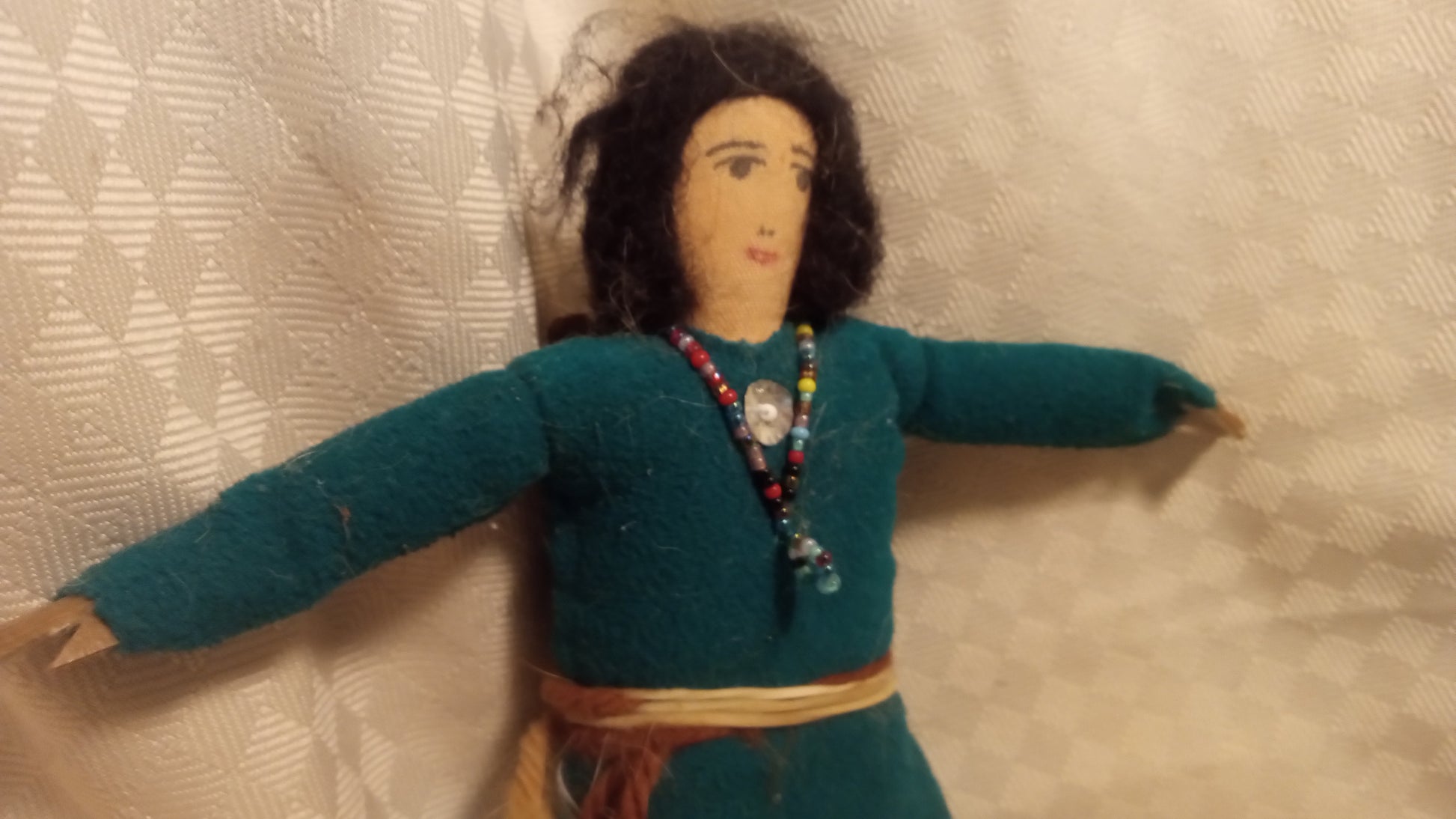 Cultural Charm: Dressed in a bright turquoise felt tunic, detailed with a simple beaded necklace, and prominently featuring the papoose bundle—a beautiful representation of care and cultural tradition.