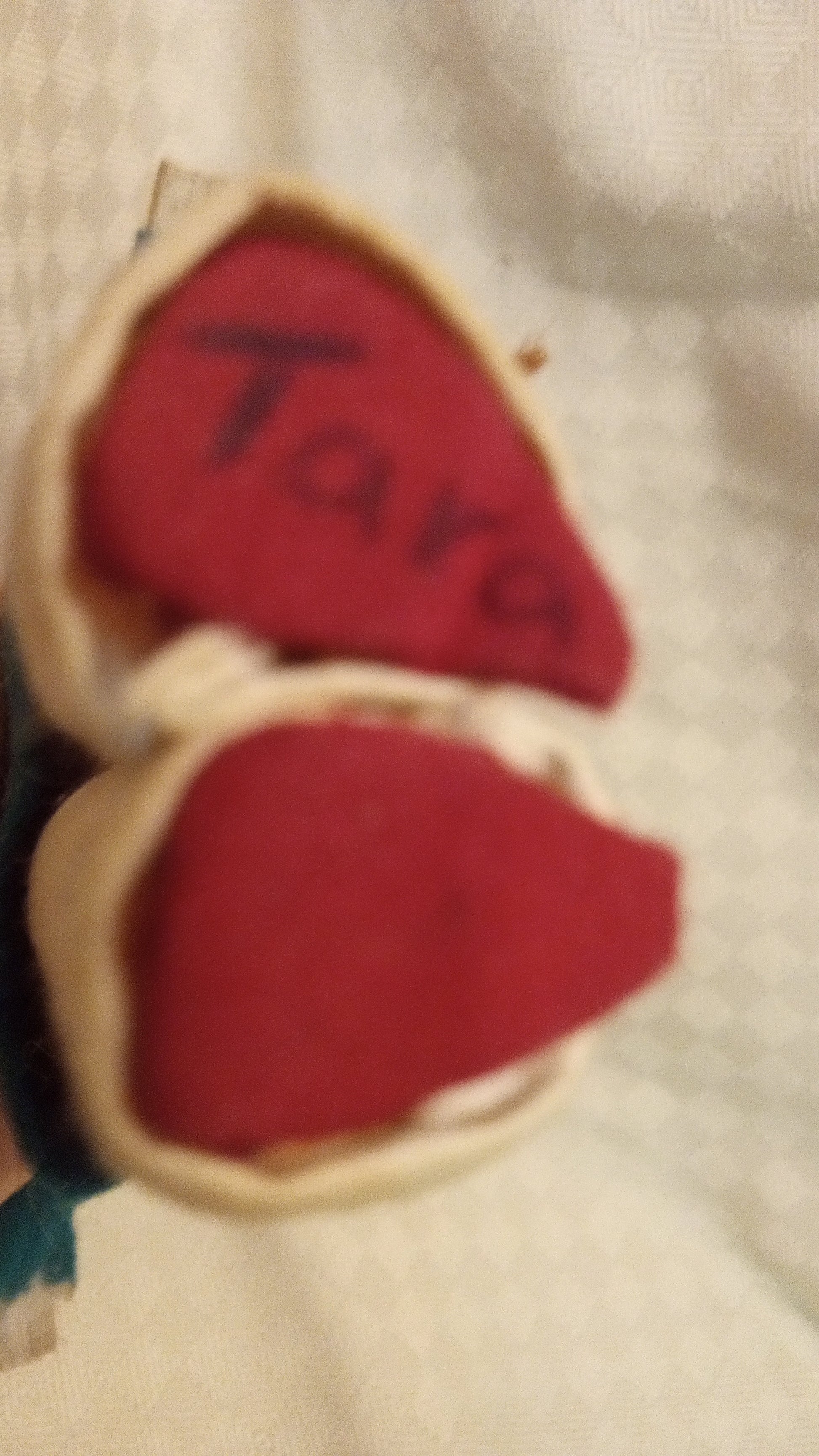 This charming figure carries more than just its baby bundle—it carries the personal signature of the artist who created it. Tucked away on the cloth feet is the artist's name: TARA. This exciting discovery transforms it from a simple souvenir into a unique piece of signed Native American folk art, likely crafted in the American Southwest during the mid-20th century (1940s–1960s).