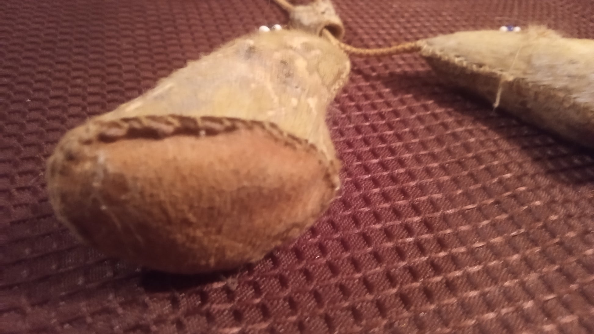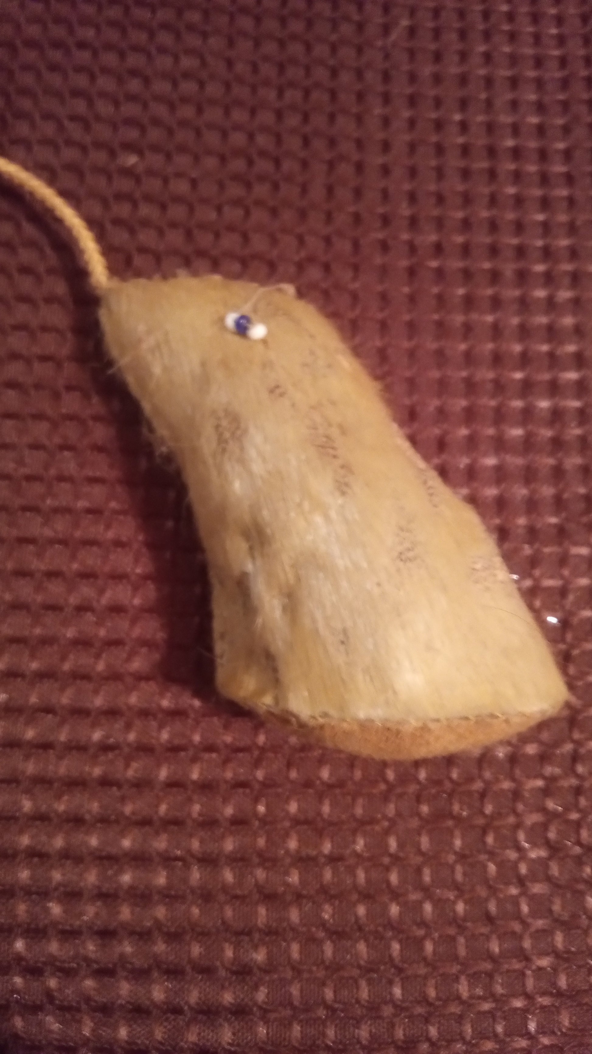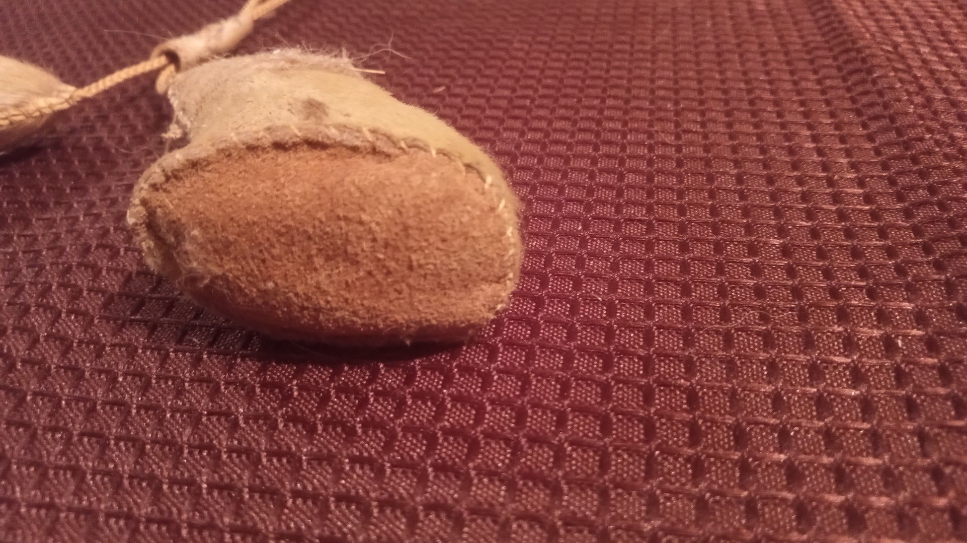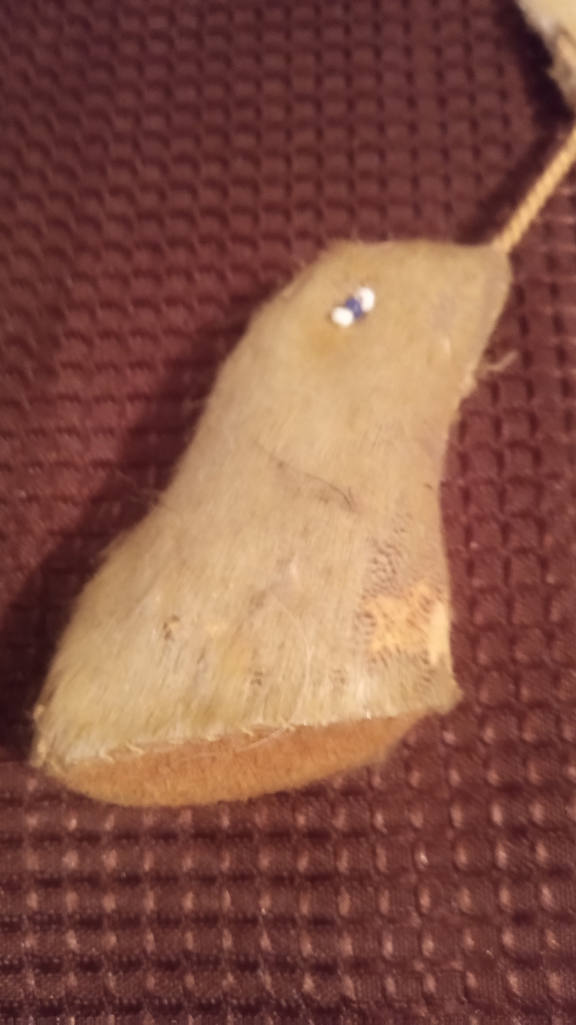Materials: Real animal fur/hide, natural or imitation sinew cord, small seed beads.